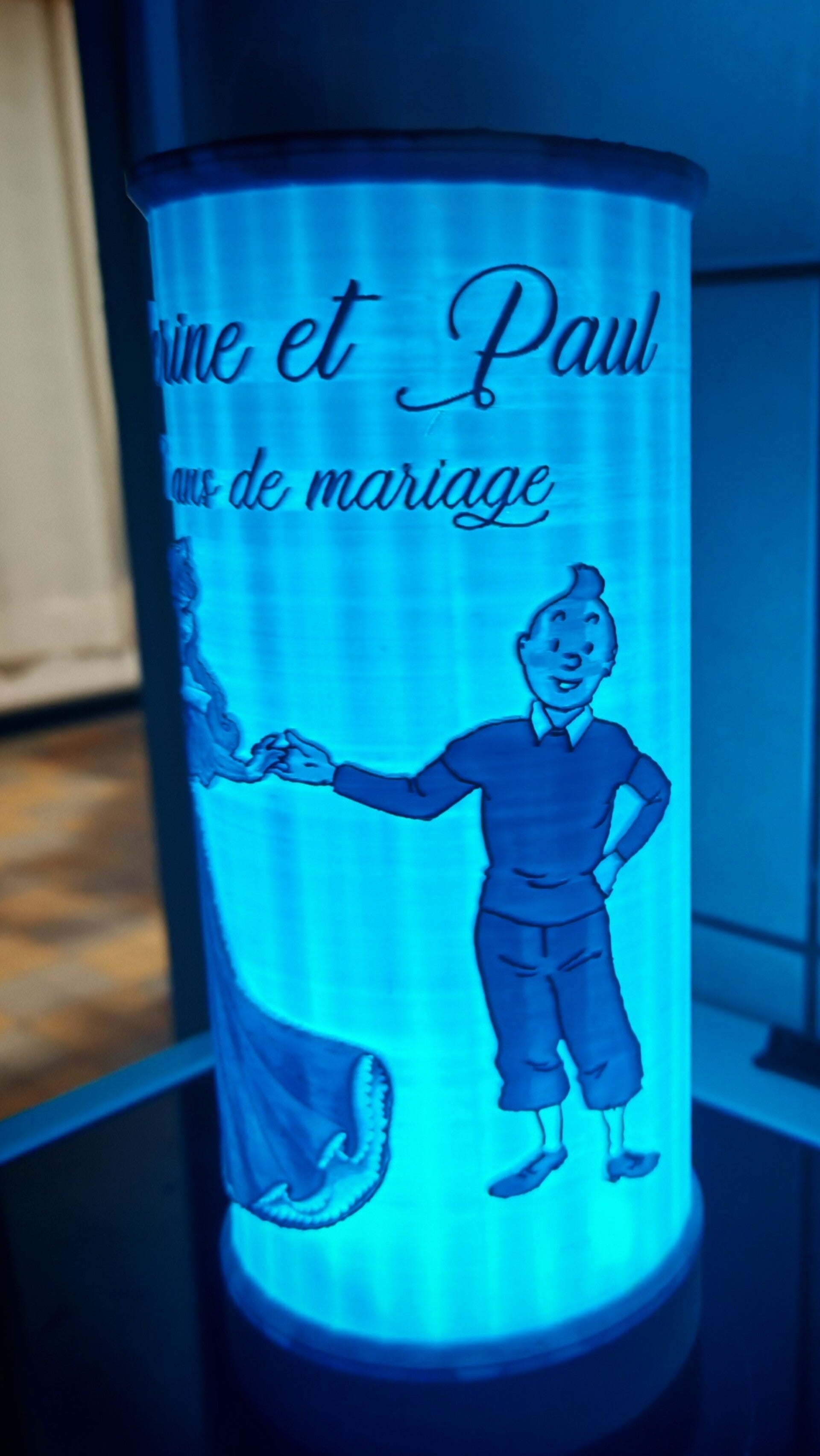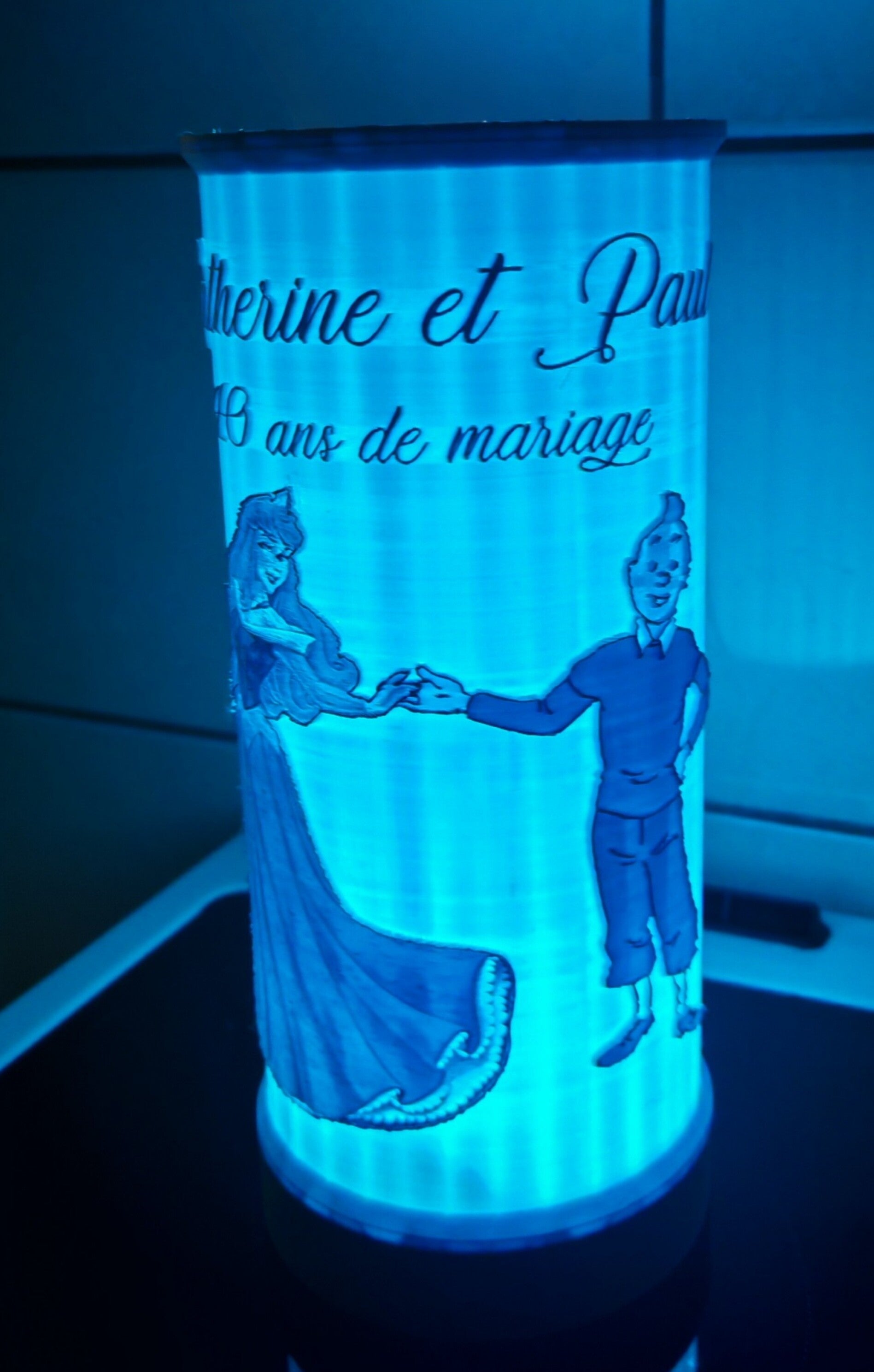 Lampe en PLA+ totalement personnalisable sur son support en bois de 10 cm de diamètre avec lumière colorées grace à la télécommande à vous de choisir votre couleur selon vos envies